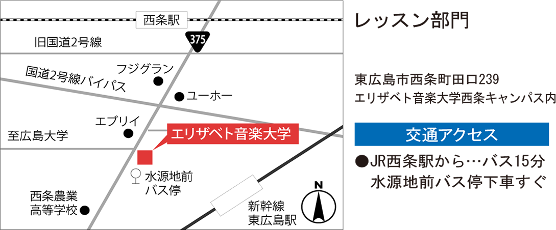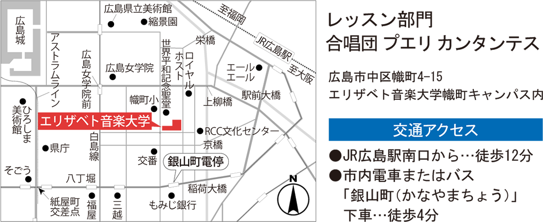 ♬本校教室/広島市中区幟町4-15エリザベト音楽大学幟町キャンパス内 ♬西条教室/東広島市西条町田口239エリザベト音楽大学西条キャンパス内